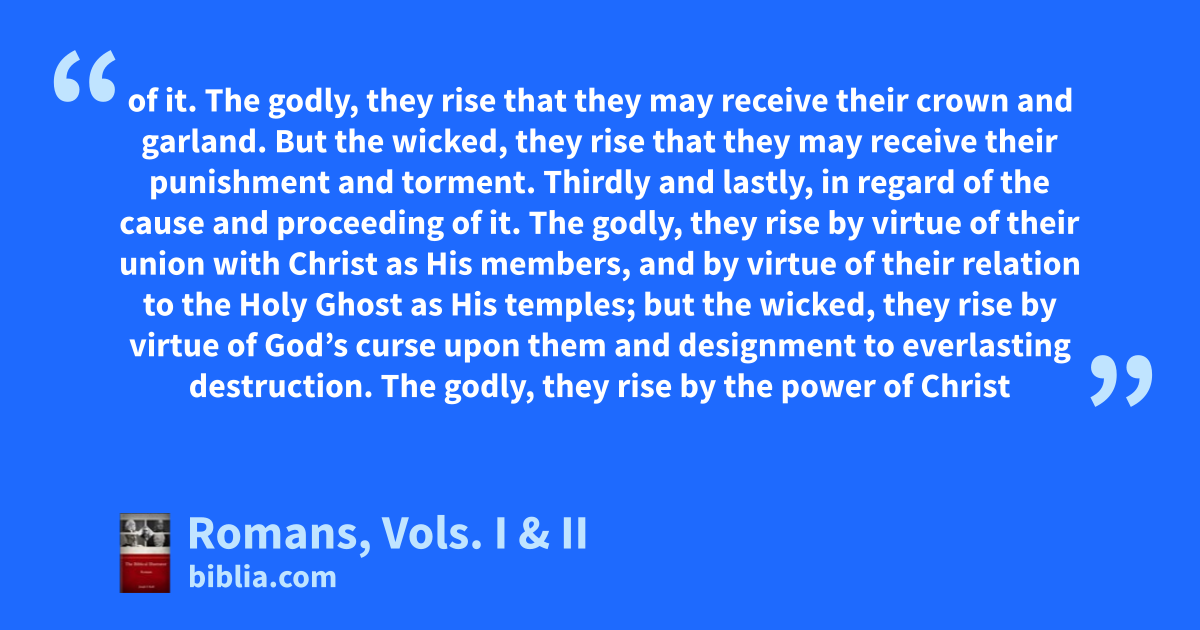 of it. The godly, they rise that they may receive their crown and garland. But the wicked, they rise that they may receive their punishment and torment. Thirdly and lastly, in regard of the cause and proceeding of it. The godly, they rise by virtue of their union with Christ as His members, and by virtue of their relation to the Holy Ghost as His temples; but the wicked, they rise by virtue of God’s curse upon them and designment to everlasting destruction. The godly, they rise by the power of Christ