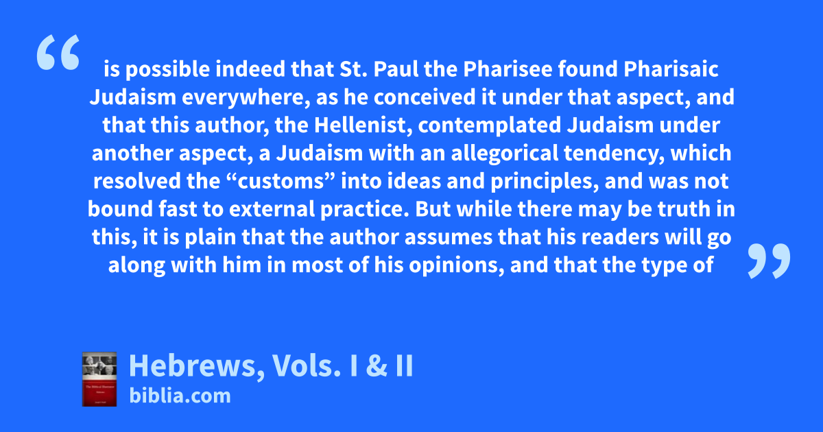 is possible indeed that St. Paul the Pharisee found Pharisaic Judaism everywhere, as he conceived it under that aspect, and that this author, the Hellenist, contemplated Judaism under another aspect, a Judaism with an allegorical tendency, which resolved the “customs” into ideas and principles, and was not bound fast to external practice. But while there may be truth in this, it is plain that the author assumes that his readers will go along with him in most of his opinions, and that the type of