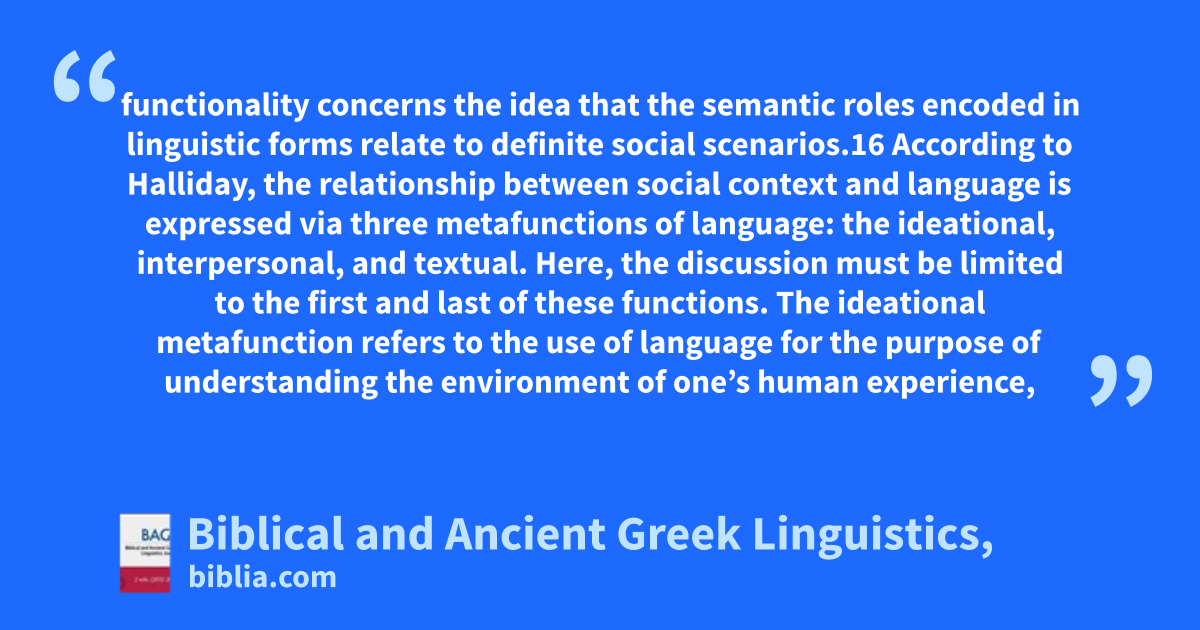 functionality concerns the idea that the semantic roles encoded in linguistic forms relate to definite social scenarios.16 According to Halliday, the relationship between social context and language is expressed via three metafunctions of language: the ideational, interpersonal, and textual. Here, the discussion must be limited to the first and last of these functions. The ideational metafunction refers to the use of language for the purpose of understanding the environment of one’s human experience,