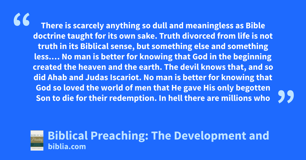 There is scarcely anything so dull and meaningless as Bible doctrine taught for its own sake. Truth divorced from life is not truth in its Biblical sense, but something else and something less.… No man is better for knowing that God in the beginning created the heaven and the earth. The devil knows that, and so did Ahab and Judas Iscariot. No man is better for knowing that God so loved the world of men that He gave His only begotten Son to die for their redemption. In hell there are millions who