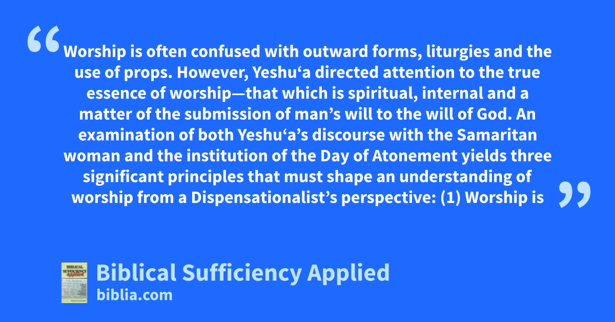 Worship is often confused with outward forms, liturgies and the use of props. However, Yeshu‘a directed attention to the true essence of worship—that which is spiritual, internal and a matter of the submission of man’s will to the will of God. An examination of both Yeshu‘a’s discourse with the Samaritan woman and the institution of the Day of Atonement yields three significant principles that must shape an understanding of worship from a Dispensationalist’s perspective: (1) Worship is