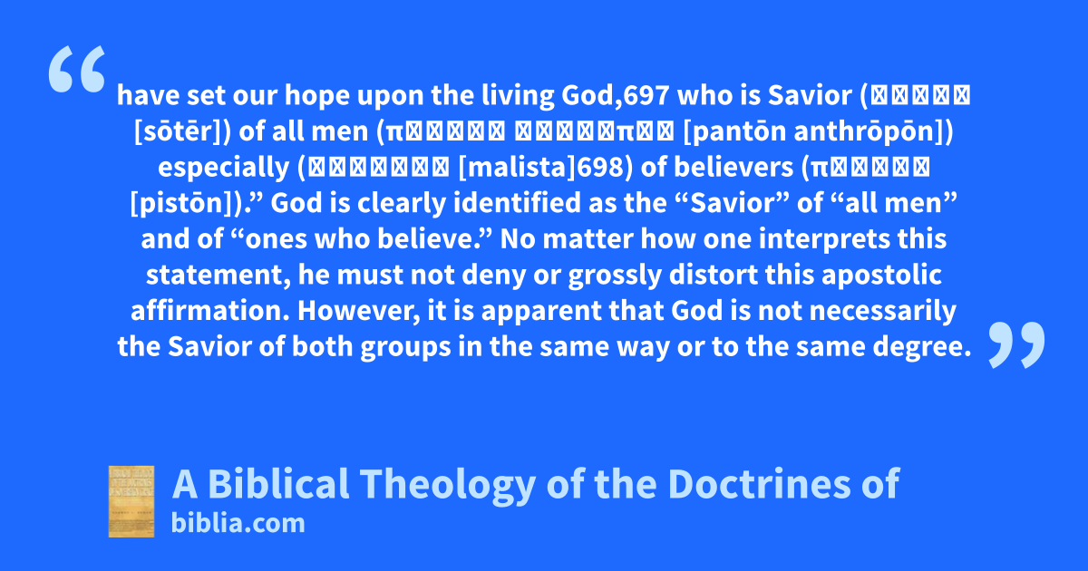 have set our hope upon the living God,697 who is Savior (σωτήρ [sōtēr]) of all men (πάντων ἀνθρώπων [pantōn anthrōpōn]) especially (μάλιστα [malista]698) of believers (πιστῶν [pistōn]).” God is clearly identified as the “Savior” of “all men” and of “ones who believe.” No matter how one interprets this statement, he must not deny or grossly distort this apostolic affirmation. However, it is apparent that God is not necessarily the Savior of both groups in the same way or to the same degree.