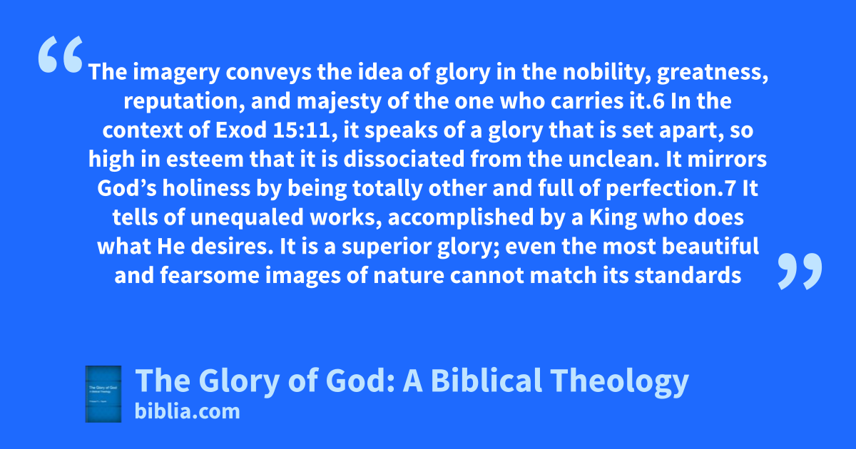The imagery conveys the idea of glory in the nobility, greatness, reputation, and majesty of the one who carries it.6 In the context of Exod 15:11, it speaks of a glory that is set apart, so high in esteem that it is dissociated from the unclean. It mirrors God’s holiness by being totally other and full of perfection.7 It tells of unequaled works, accomplished by a King who does what He desires. It is a superior glory; even the most beautiful and fearsome images of nature cannot match its standards