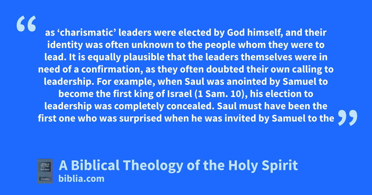 as ‘charismatic’ leaders were elected by God himself, and their identity was often unknown to the people whom they were to lead. It is equally plausible that the leaders themselves were in need of a confirmation, as they often doubted their own calling to leadership. For example, when Saul was anointed by Samuel to become the first king of Israel (1 Sam. 10), his election to leadership was completely concealed. Saul must have been the first one who was surprised when he was invited by Samuel to the