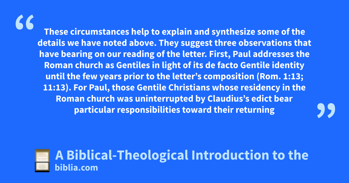 These circumstances help to explain and synthesize some of the details we have noted above. They suggest three observations that have bearing on our reading of the letter. First, Paul addresses the Roman church as Gentiles in light of its de facto Gentile identity until the few years prior to the letter’s composition (Rom. 1:13; 11:13). For Paul, those Gentile Christians whose residency in the Roman church was uninterrupted by Claudius’s edict bear particular responsibilities toward their returning