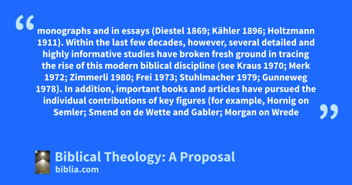 monographs and in essays (Diestel 1869; Kähler 1896; Holtzmann 1911). Within the last few decades, however, several detailed and highly informative studies have broken fresh ground in tracing the rise of this modern biblical discipline (see Kraus 1970; Merk 1972; Zimmerli 1980; Frei 1973; Stuhlmacher 1979; Gunneweg 1978). In addition, important books and articles have pursued the individual contributions of key figures (for example, Hornig on Semler; Smend on de Wette and Gabler; Morgan on Wrede