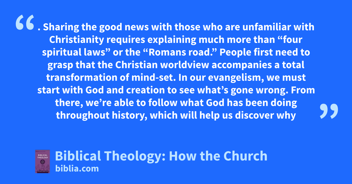 . Sharing the good news with those who are unfamiliar with Christianity requires explaining much more than “four spiritual laws” or the “Romans road.” People first need to grasp that the Christian worldview accompanies a total transformation of mind-set. In our evangelism, we must start with God and creation to see what’s gone wrong. From there, we’re able to follow what God has been doing throughout history, which will help us discover why