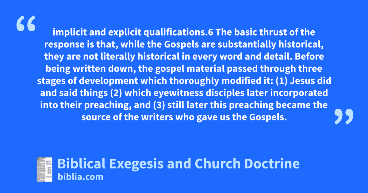 implicit and explicit qualifications.6 The basic thrust of the response is that, while the Gospels are substantially historical, they are not literally historical in every word and detail. Before being written down, the gospel material passed through three stages of development which thoroughly modified it: (1) Jesus did and said things (2) which eyewitness disciples later incorporated into their preaching, and (3) still later this preaching became the source of the writers who gave us the Gospels.