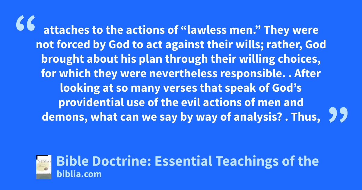 attaches to the actions of “lawless men.” They were not forced by God to act against their wills; rather, God brought about his plan through their willing choices, for which they were nevertheless responsible. . After looking at so many verses that speak of God’s providential use of the evil actions of men and demons, what can we say by way of analysis? . Thus,