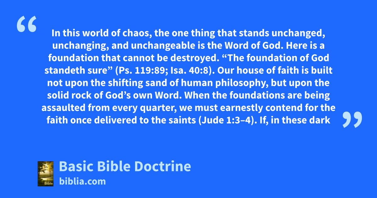 In this world of chaos, the one thing that stands unchanged, unchanging, and unchangeable is the Word of God. Here is a foundation that cannot be destroyed. “The foundation of God standeth sure” (Ps. 119:89; Isa. 40:8). Our house of faith is built not upon the shifting sand of human philosophy, but upon the solid rock of God’s own Word. When the foundations are being assaulted from every quarter, we must earnestly contend for the faith once delivered to the saints (Jude 1:3–4). If, in these dark