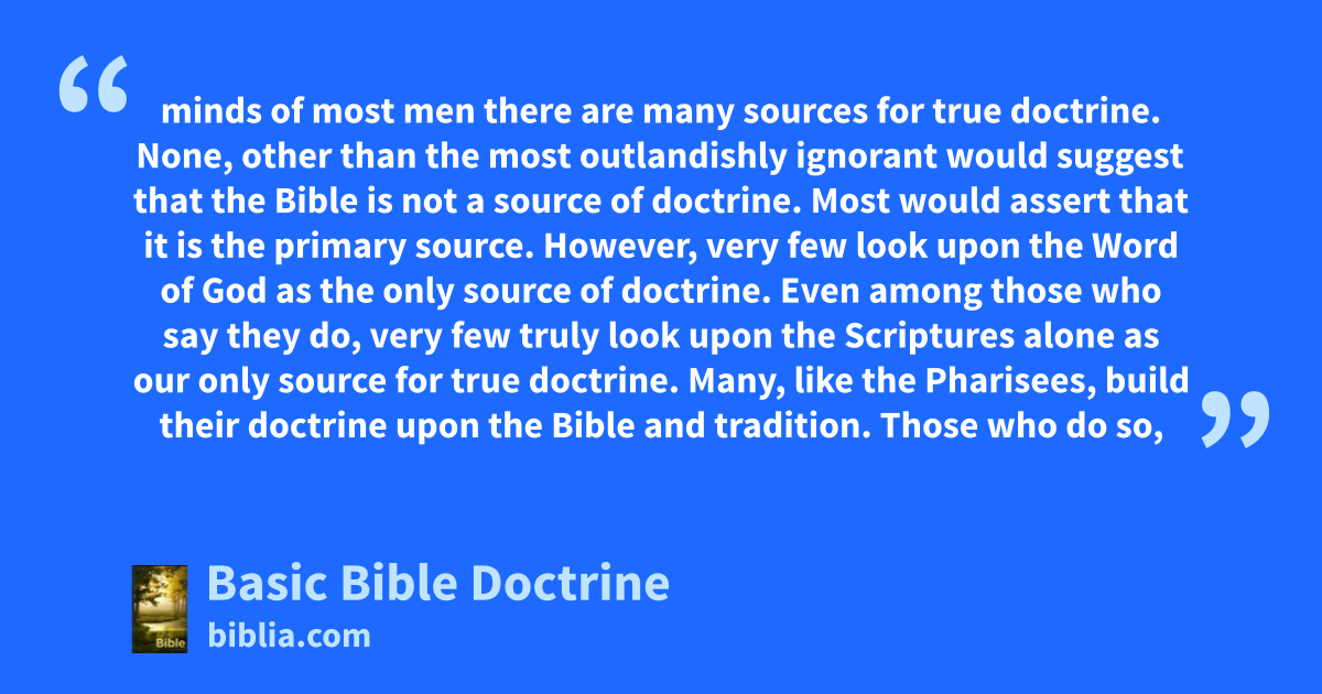 minds of most men there are many sources for true doctrine. None, other than the most outlandishly ignorant would suggest that the Bible is not a source of doctrine. Most would assert that it is the primary source. However, very few look upon the Word of God as the only source of doctrine. Even among those who say they do, very few truly look upon the Scriptures alone as our only source for true doctrine. Many, like the Pharisees, build their doctrine upon the Bible and tradition. Those who do so,