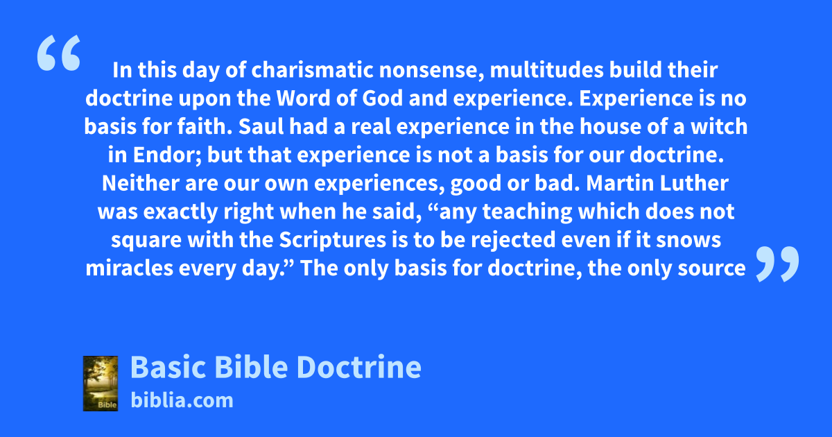 In this day of charismatic nonsense, multitudes build their doctrine upon the Word of God and experience. Experience is no basis for faith. Saul had a real experience in the house of a witch in Endor; but that experience is not a basis for our doctrine. Neither are our own experiences, good or bad. Martin Luther was exactly right when he said, “any teaching which does not square with the Scriptures is to be rejected even if it snows miracles every day.” The only basis for doctrine, the only source