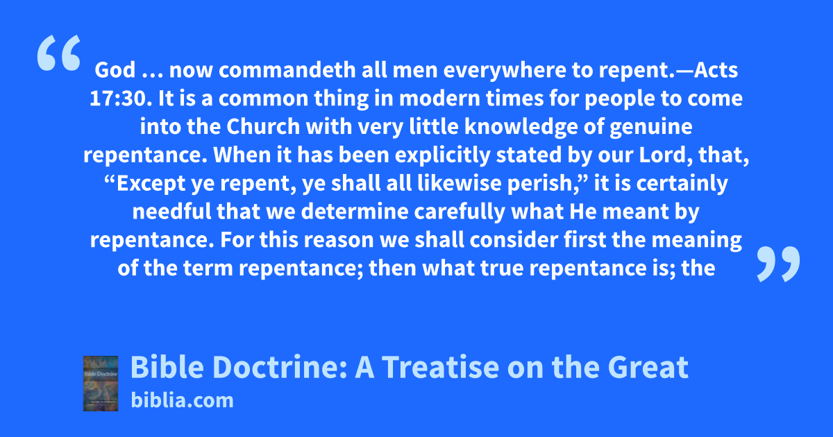 God … now commandeth all men everywhere to repent.—Acts 17:30. It is a common thing in modern times for people to come into the Church with very little knowledge of genuine repentance. When it has been explicitly stated by our Lord, that, “Except ye repent, ye shall all likewise perish,” it is certainly needful that we determine carefully what He meant by repentance. For this reason we shall consider first the meaning of the term repentance; then what true repentance is; the