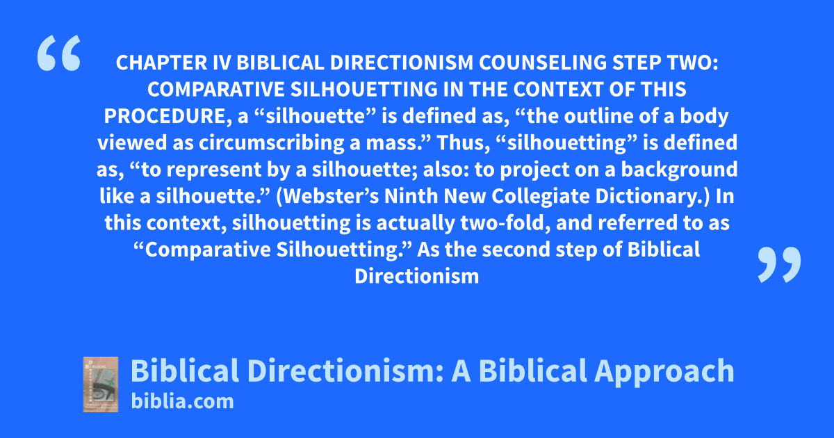 CHAPTER IV BIBLICAL DIRECTIONISM COUNSELING STEP TWO: COMPARATIVE SILHOUETTING IN THE CONTEXT OF THIS PROCEDURE, a “silhouette” is defined as, “the outline of a body viewed as circumscribing a mass.” Thus, “silhouetting” is defined as, “to represent by a silhouette; also: to project on a background like a silhouette.” (Webster’s Ninth New Collegiate Dictionary.) In this context, silhouetting is actually two-fold, and referred to as “Comparative Silhouetting.” As the second step of Biblical Directionism