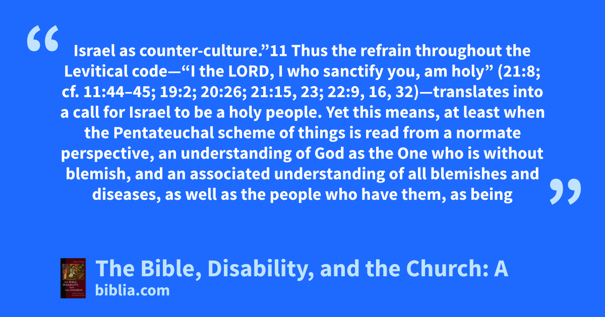 Israel as counter-culture.”11 Thus the refrain throughout the Levitical code—“I the LORD, I who sanctify you, am holy” (21:8; cf. 11:44–45; 19:2; 20:26; 21:15, 23; 22:9, 16, 32)—translates into a call for Israel to be a holy people. Yet this means, at least when the Pentateuchal scheme of things is read from a normate perspective, an understanding of God as the One who is without blemish, and an associated understanding of all blemishes and diseases, as well as the people who have them, as being