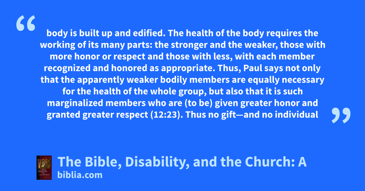 body is built up and edified. The health of the body requires the working of its many parts: the stronger and the weaker, those with more honor or respect and those with less, with each member recognized and honored as appropriate. Thus, Paul says not only that the apparently weaker bodily members are equally necessary for the health of the whole group, but also that it is such marginalized members who are (to be) given greater honor and granted greater respect (12:23). Thus no gift—and no individual