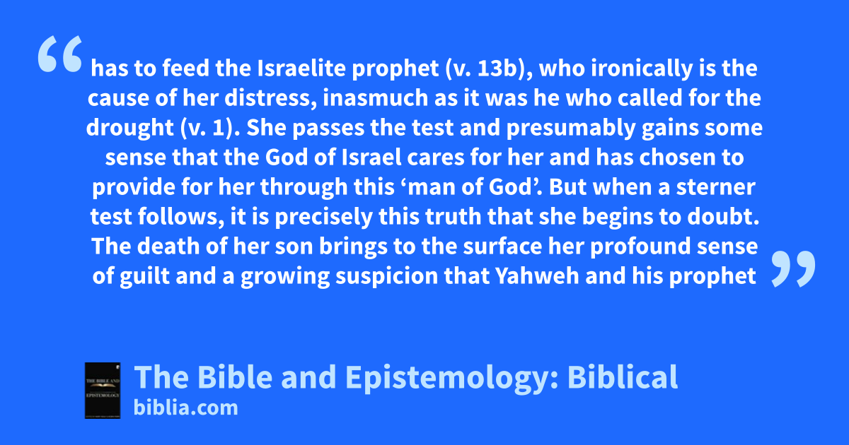 has to feed the Israelite prophet (v. 13b), who ironically is the cause of her distress, inasmuch as it was he who called for the drought (v. 1). She passes the test and presumably gains some sense that the God of Israel cares for her and has chosen to provide for her through this ‘man of God’. But when a sterner test follows, it is precisely this truth that she begins to doubt. The death of her son brings to the surface her profound sense of guilt and a growing suspicion that Yahweh and his prophet
