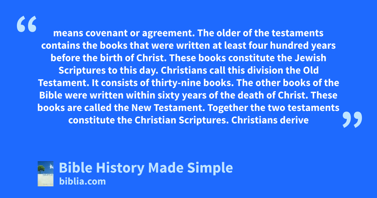 means covenant or agreement. The older of the testaments contains the books that were written at least four hundred years before the birth of Christ. These books constitute the Jewish Scriptures to this day. Christians call this division the Old Testament. It consists of thirty-nine books. The other books of the Bible were written within sixty years of the death of Christ. These books are called the New Testament. Together the two testaments constitute the Christian Scriptures. Christians derive