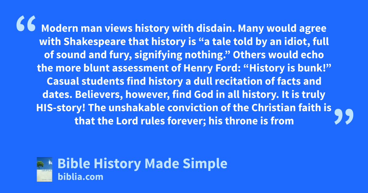 Modern man views history with disdain. Many would agree with Shakespeare that history is “a tale told by an idiot, full of sound and fury, signifying nothing.” Others would echo the more blunt assessment of Henry Ford: “History is bunk!” Casual students find history a dull recitation of facts and dates. Believers, however, find God in all history. It is truly HIS-story! The unshakable conviction of the Christian faith is that the Lord rules forever; his throne is from