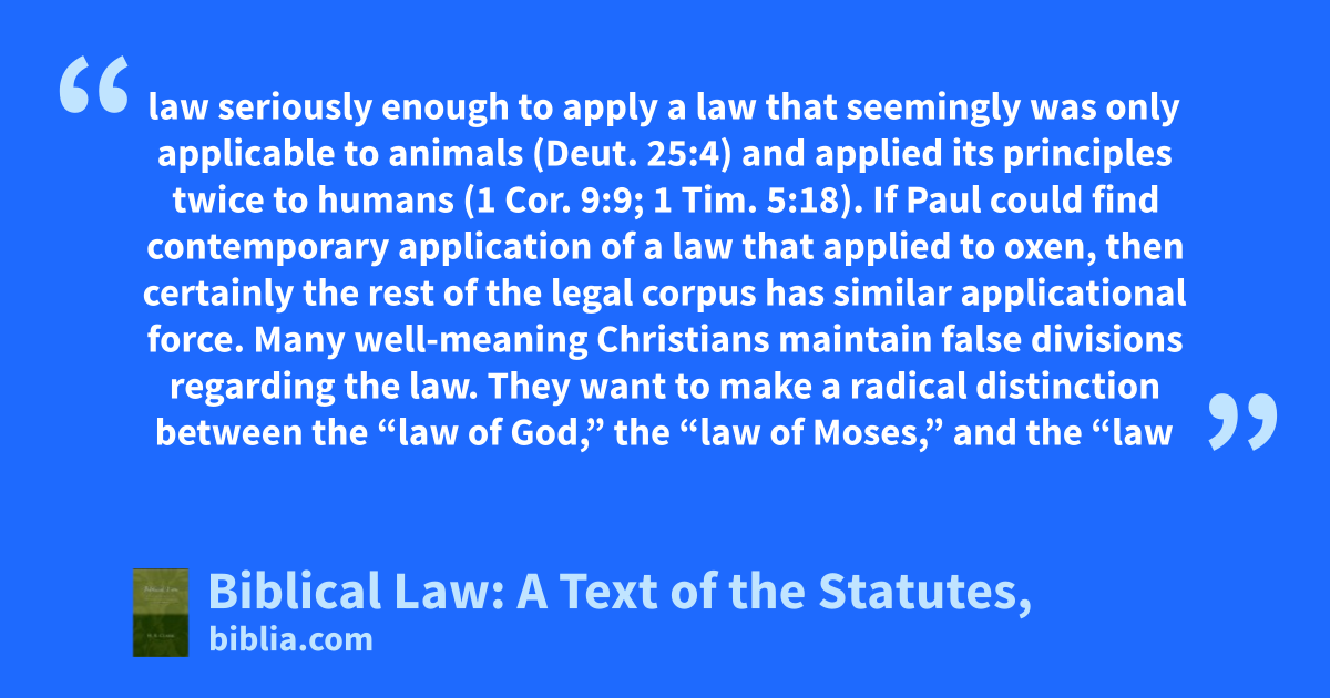 law seriously enough to apply a law that seemingly was only applicable to animals (Deut. 25:4) and applied its principles twice to humans (1 Cor. 9:9; 1 Tim. 5:18). If Paul could find contemporary application of a law that applied to oxen, then certainly the rest of the legal corpus has similar applicational force. Many well-meaning Christians maintain false divisions regarding the law. They want to make a radical distinction between the “law of God,” the “law of Moses,” and the “law