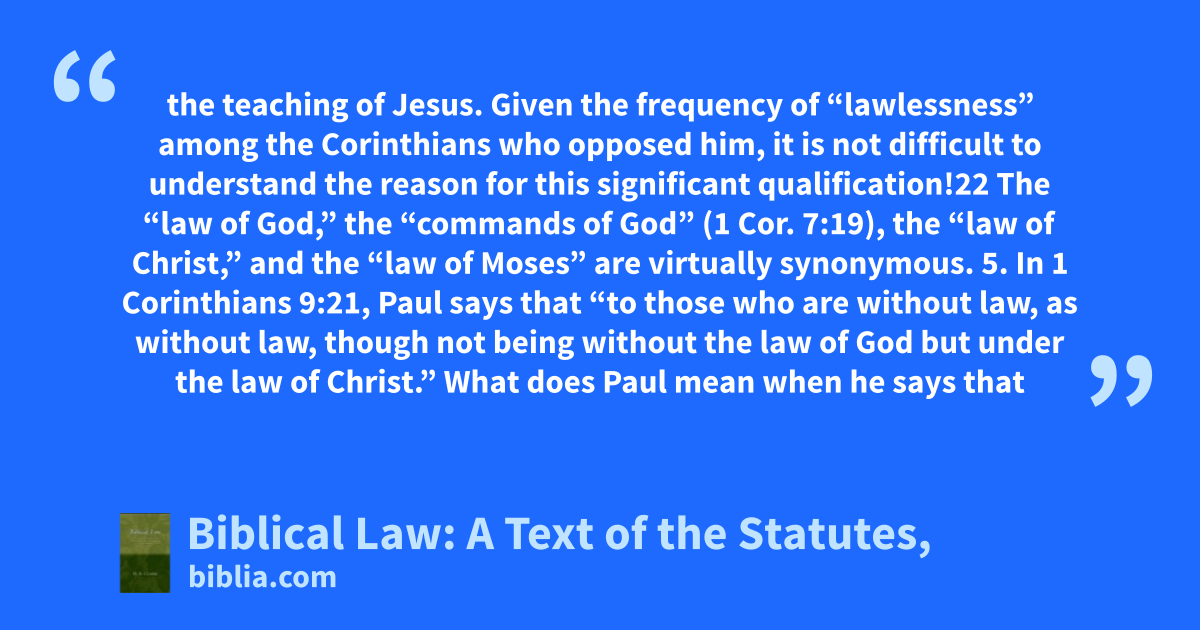the teaching of Jesus. Given the frequency of “lawlessness” among the Corinthians who opposed him, it is not difficult to understand the reason for this significant qualification!22 The “law of God,” the “commands of God” (1 Cor. 7:19), the “law of Christ,” and the “law of Moses” are virtually synonymous. 5. In 1 Corinthians 9:21, Paul says that “to those who are without law, as without law, though not being without the law of God but under the law of Christ.” What does Paul mean when he says that