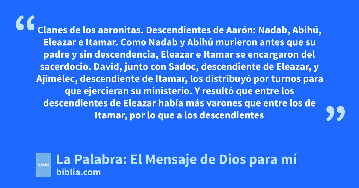 24 Clanes de los aaronitas. Descendientes de Aarón: Nadab, Abihú, Eleazar e Itamar. 2 Como Nadab y Abihú murieron antes que su padre y sin descendencia, Eleazar e Itamar se encargaron del sacerdocio. 3 David, junto con Sadoc, descendiente de Eleazar, y Ajimélec, descendiente de Itamar, los distribuyó por turnos para que ejercieran su ministerio. 4 Y resultó que entre los descendientes de Eleazar había más varones que entre los de Itamar, por lo que a los descendientes de Eleazar correspondieron dieciséis cabezas de familia y a los descendientes de Itamar, ocho. 5 El reparto de unos y otros se hizo por sorteo, ya que tanto entre los descendientes de Eleazar como entre los de Itamar, había ministros del santuario y ministros de Dios. 6 El secretario Semaías, levita hijo de Natanael, los inscribió en presencia del rey, de las autoridades, del sacerdote Sadoc, de Ajimélec, hijo de Abiatar, y de los jefes de las familias sacerdotales y levíticas. Dos turnos correspondían a la familia de Eleazar y uno a la de Itamar. 7 El primer turno tocó a Jeorib, el segundo a Jedaías, 8 el tercero a Jarín, el cuarto a Seorín, 9 el quinto a Malquías, el sexto a Miyamín, 10 el séptimo a Hacós, el octavo a Abías, 11 el noveno a Jesúa, el décimo a Secanías, 12 el undécimo a Eliasib, el duodécimo a Jaquín, 13 el décimo tercero a Jupá, el décimo cuarto a Jesebab, 14 el décimo quinto a Bilgá, el décimo sexto a Imer, 15 el décimo séptimo a Jerib, el décimo octavo a Hapises, 16 el décimo noveno a Petajías, el vigésimo a Ezequiel, 17 el vigésimo primero a Jaquín, el vigésimo segundo a Gamul, 18 el vigésimo tercero a Delaías y el vigésimo cuarto a Maazías.