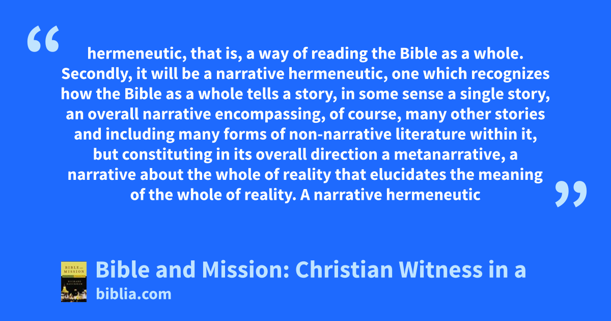 hermeneutic, that is, a way of reading the Bible as a whole. Secondly, it will be a narrative hermeneutic, one which recognizes how the Bible as a whole tells a story, in some sense a single story, an overall narrative encompassing, of course, many other stories and including many forms of non-narrative literature within it, but constituting in its overall direction a metanarrative, a narrative about the whole of reality that elucidates the meaning of the whole of reality. A narrative hermeneutic