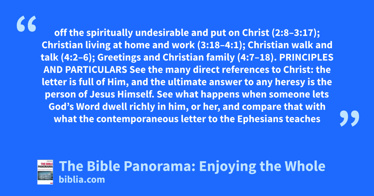 off the spiritually undesirable and put on Christ (2:8–3:17); Christian living at home and work (3:18–4:1); Christian walk and talk (4:2–6); Greetings and Christian family (4:7–18). PRINCIPLES AND PARTICULARS See the many direct references to Christ: the letter is full of Him, and the ultimate answer to any heresy is the person of Jesus Himself. See what happens when someone lets God’s Word dwell richly in him, or her, and compare that with what the contemporaneous letter to the Ephesians teaches