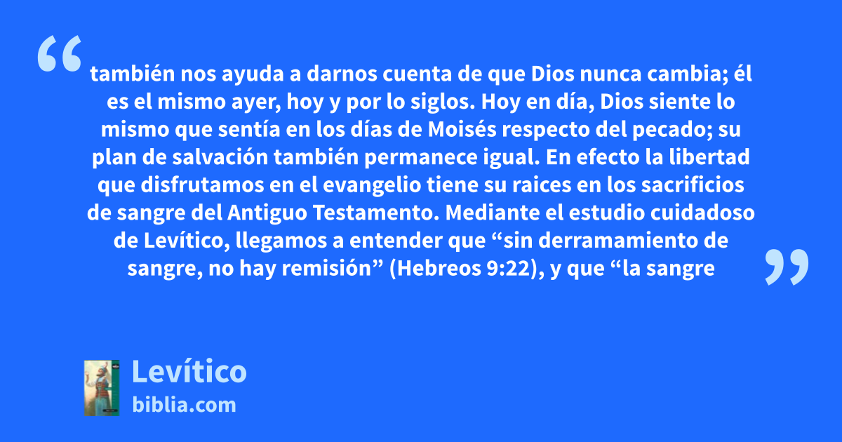 también nos ayuda a darnos cuenta de que Dios nunca cambia; él es el mismo ayer, hoy y por lo siglos. Hoy en día, Dios siente lo mismo que sentía en los días de Moisés respecto del pecado; su plan de salvación también permanece igual. En efecto la libertad que disfrutamos en el evangelio tiene su raices en los sacrificios de sangre del Antiguo Testamento. Mediante el estudio cuidadoso de Levítico, llegamos a entender que “sin derramamiento de sangre, no hay remisión” (Hebreos 9:22), y que “la sangre