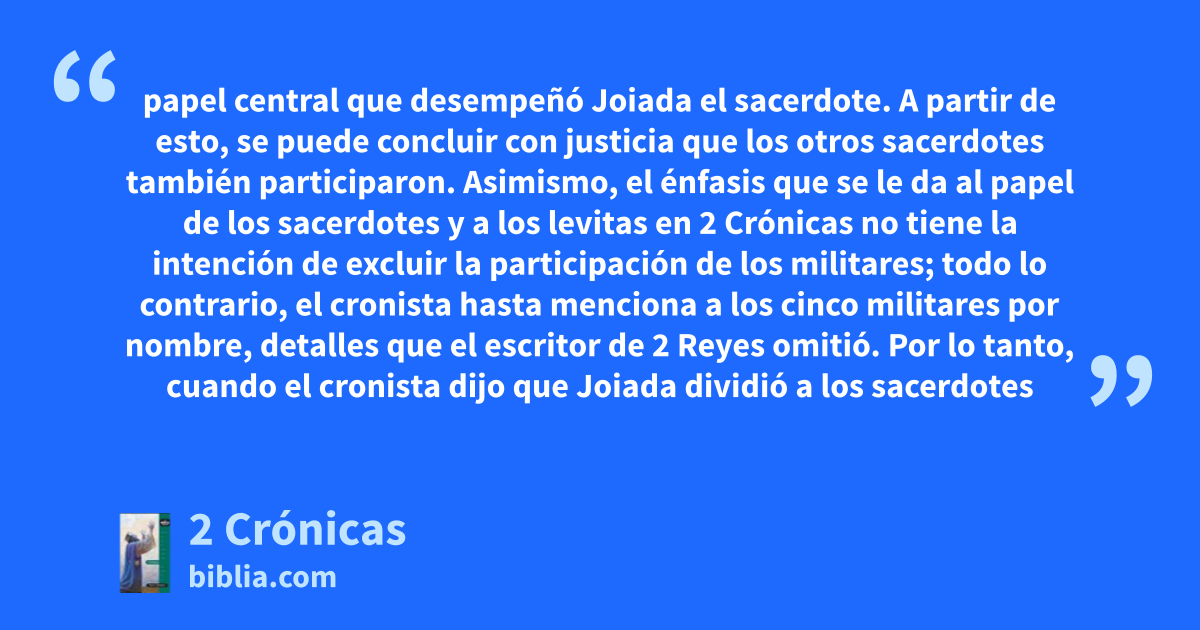 papel central que desempeñó Joiada el sacerdote. A partir de esto, se puede concluir con justicia que los otros sacerdotes también participaron. Asimismo, el énfasis que se le da al papel de los sacerdotes y a los levitas en 2 Crónicas no tiene la intención de excluir la participación de los militares; todo lo contrario, el cronista hasta menciona a los cinco militares por nombre, detalles que el escritor de 2 Reyes omitió. Por lo tanto, cuando el cronista dijo que Joiada dividió a los sacerdotes