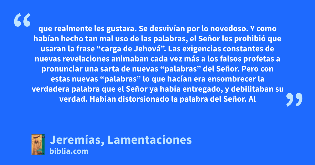 que realmente les gustara. Se desvivían por lo novedoso. Y como habían hecho tan mal uso de las palabras, el Señor les prohibió que usaran la frase “carga de Jehová”. Las exigencias constantes de nuevas revelaciones animaban cada vez más a los falsos profetas a pronunciar una sarta de nuevas “palabras” del Señor. Pero con estas nuevas “palabras” lo que hacían era ensombrecer la verdadera palabra que el Señor ya había entregado, y debilitaban su verdad. Habían distorsionado la palabra del Señor. Al