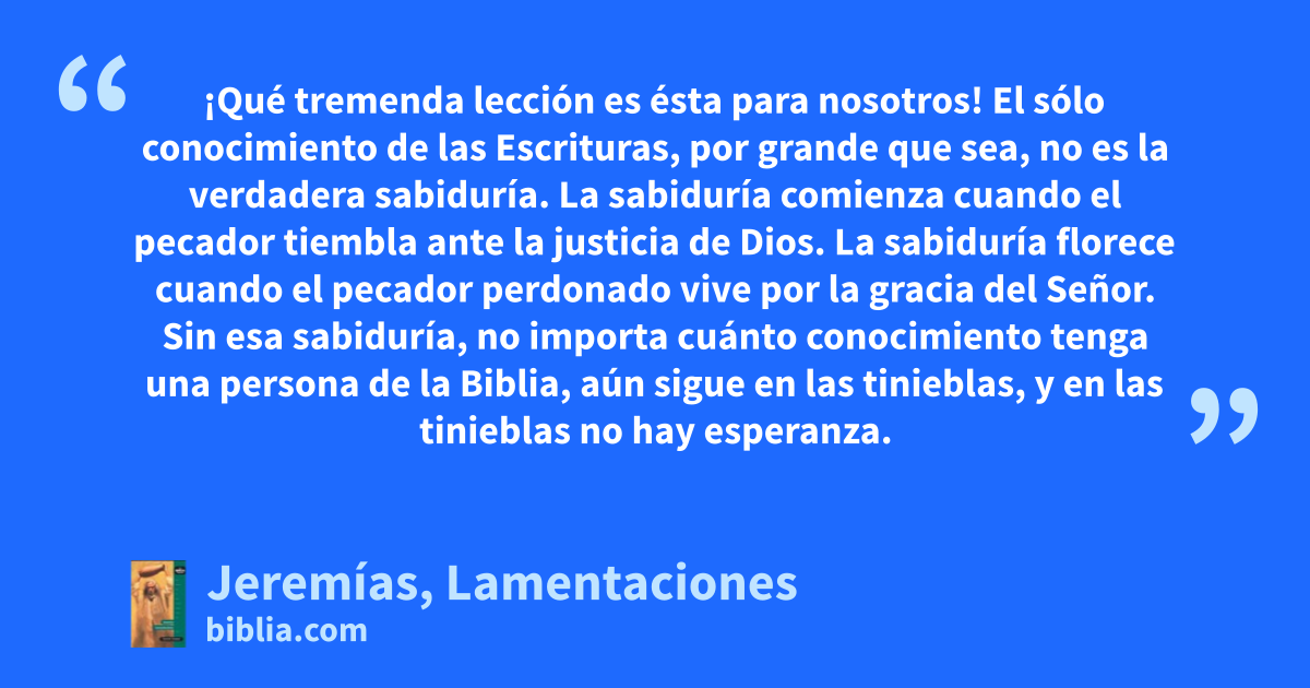 ¡Qué tremenda lección es ésta para nosotros! El sólo conocimiento de las Escrituras, por grande que sea, no es la verdadera sabiduría. La sabiduría comienza cuando el pecador tiembla ante la justicia de Dios. La sabiduría florece cuando el pecador perdonado vive por la gracia del Señor. Sin esa sabiduría, no importa cuánto conocimiento tenga una persona de la Biblia, aún sigue en las tinieblas, y en las tinieblas no hay esperanza.