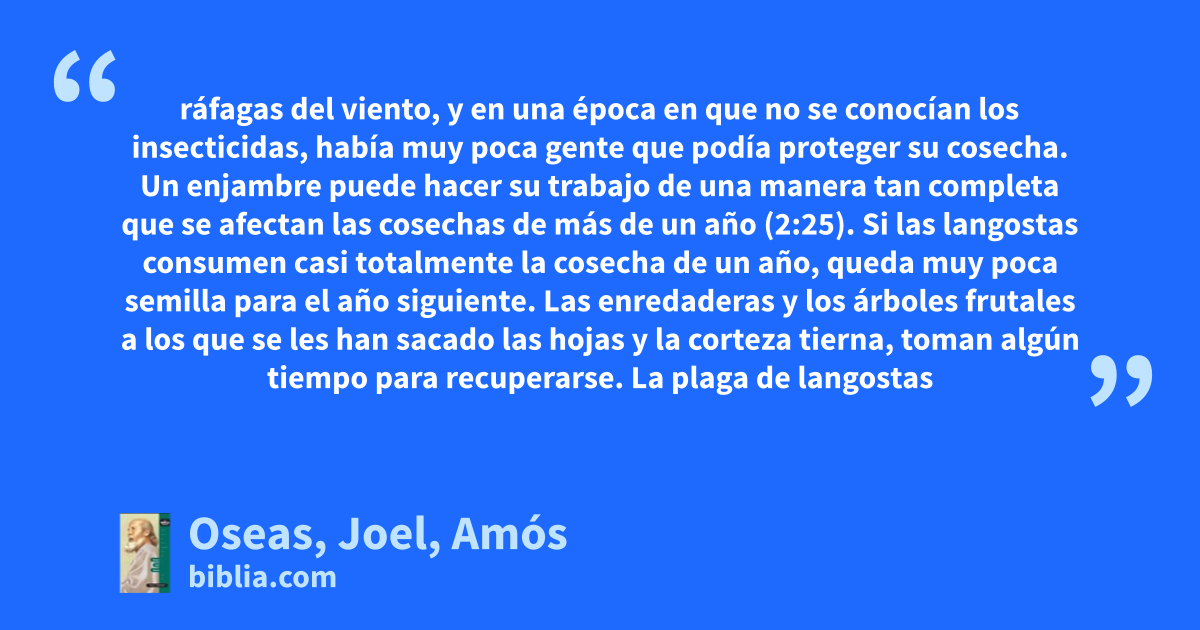 ráfagas del viento, y en una época en que no se conocían los insecticidas, había muy poca gente que podía proteger su cosecha. Un enjambre puede hacer su trabajo de una manera tan completa que se afectan las cosechas de más de un año (2:25). Si las langostas consumen casi totalmente la cosecha de un año, queda muy poca semilla para el año siguiente. Las enredaderas y los árboles frutales a los que se les han sacado las hojas y la corteza tierna, toman algún tiempo para recuperarse. La plaga de langostas