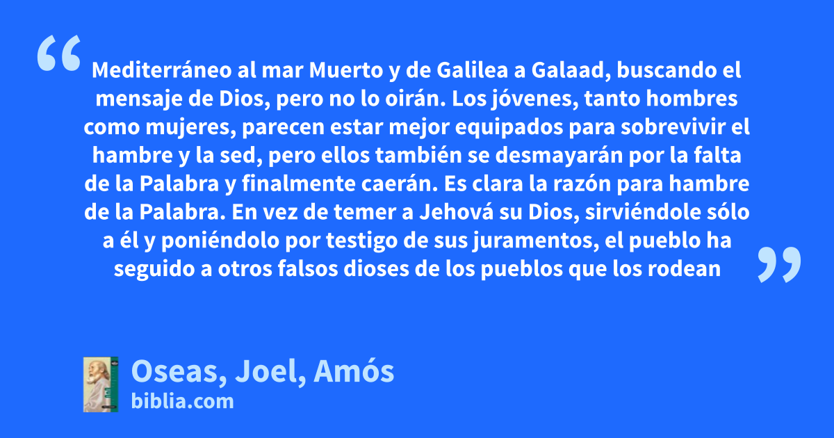 Mediterráneo al mar Muerto y de Galilea a Galaad, buscando el mensaje de Dios, pero no lo oirán. Los jóvenes, tanto hombres como mujeres, parecen estar mejor equipados para sobrevivir el hambre y la sed, pero ellos también se desmayarán por la falta de la Palabra y finalmente caerán. Es clara la razón para hambre de la Palabra. En vez de temer a Jehová su Dios, sirviéndole sólo a él y poniéndolo por testigo de sus juramentos, el pueblo ha seguido a otros falsos dioses de los pueblos que los rodean