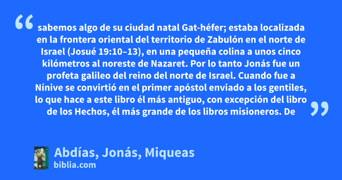 sabemos algo de su ciudad natal Gat-héfer; estaba localizada en la frontera oriental del territorio de Zabulón en el norte de Israel (Josué 19:10–13), en una pequeña colina a unos cinco kilómetros al noreste de Nazaret. Por lo tanto Jonás fue un profeta galileo del reino del norte de Israel. Cuando fue a Nínive se convirtió en el primer apóstol enviado a los gentiles, lo que hace a este libro él más antiguo, con excepción del libro de los Hechos, él más grande de los libros misioneros. De
