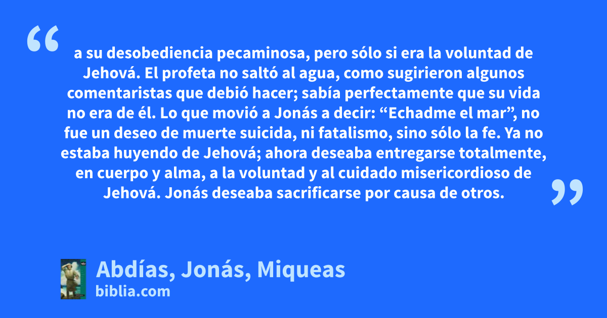 a su desobediencia pecaminosa, pero sólo si era la voluntad de Jehová. El profeta no saltó al agua, como sugirieron algunos comentaristas que debió hacer; sabía perfectamente que su vida no era de él. Lo que movió a Jonás a decir: “Echadme el mar”, no fue un deseo de muerte suicida, ni fatalismo, sino sólo la fe. Ya no estaba huyendo de Jehová; ahora deseaba entregarse totalmente, en cuerpo y alma, a la voluntad y al cuidado misericordioso de Jehová. Jonás deseaba sacrificarse por causa de otros.