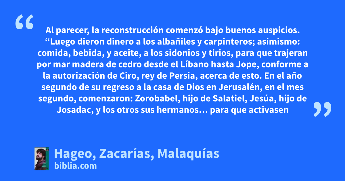 Al parecer, la reconstrucción comenzó bajo buenos auspicios. “Luego dieron dinero a los albañiles y carpinteros; asimismo: comida, bebida, y aceite, a los sidonios y tirios, para que trajeran por mar madera de cedro desde el Líbano hasta Jope, conforme a la autorización de Ciro, rey de Persia, acerca de esto. En el año segundo de su regreso a la casa de Dios en Jerusalén, en el mes segundo, comenzaron: Zorobabel, hijo de Salatiel, Jesúa, hijo de Josadac, y los otros sus hermanos… para que activasen