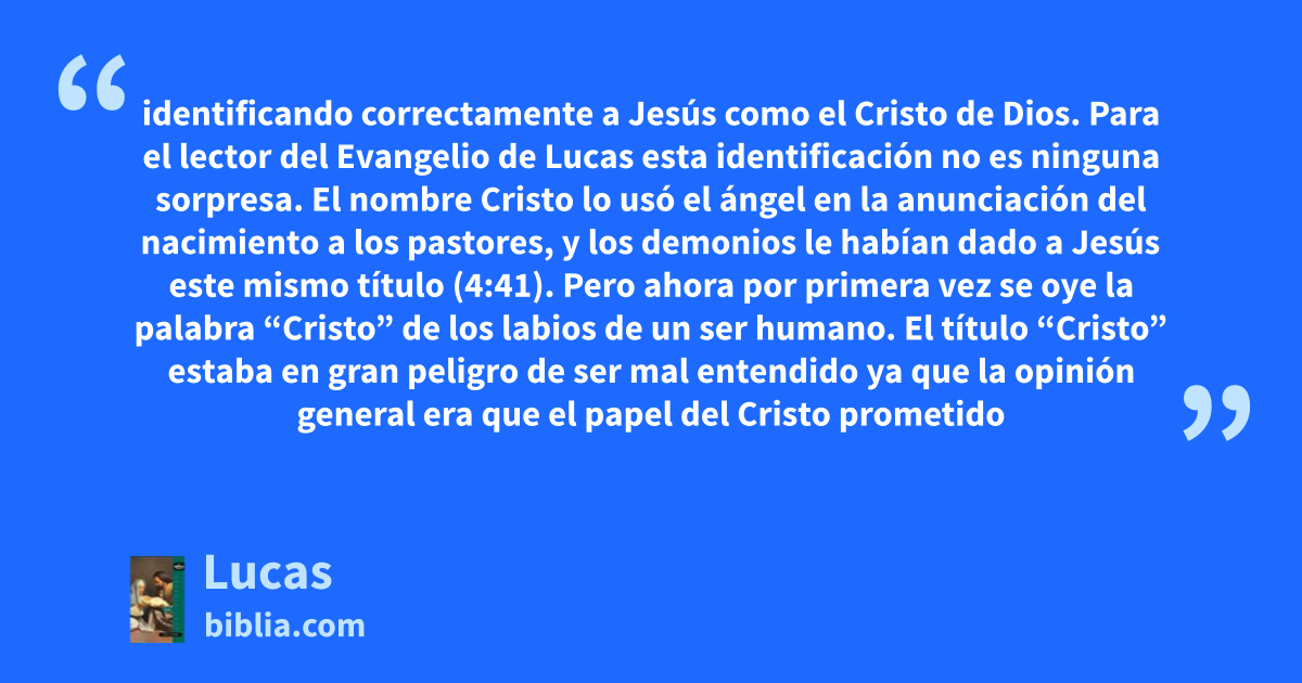 identificando correctamente a Jesús como el Cristo de Dios. Para el lector del Evangelio de Lucas esta identificación no es ninguna sorpresa. El nombre Cristo lo usó el ángel en la anunciación del nacimiento a los pastores, y los demonios le habían dado a Jesús este mismo título (4:41). Pero ahora por primera vez se oye la palabra “Cristo” de los labios de un ser humano. El título “Cristo” estaba en gran peligro de ser mal entendido ya que la opinión general era que el papel del Cristo prometido