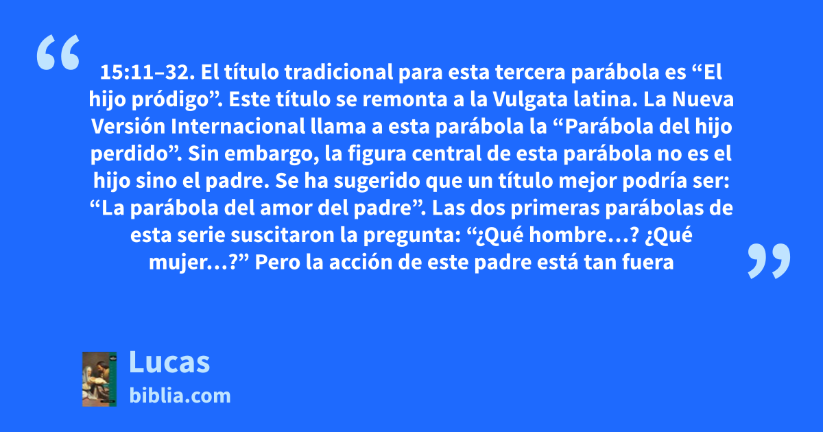 15:11–32. El título tradicional para esta tercera parábola es “El hijo pródigo”. Este título se remonta a la Vulgata latina. La Nueva Versión Internacional llama a esta parábola la “Parábola del hijo perdido”. Sin embargo, la figura central de esta parábola no es el hijo sino el padre. Se ha sugerido que un título mejor podría ser: “La parábola del amor del padre”. Las dos primeras parábolas de esta serie suscitaron la pregunta: “¿Qué hombre…? ¿Qué mujer…?” Pero la acción de este padre está tan fuera