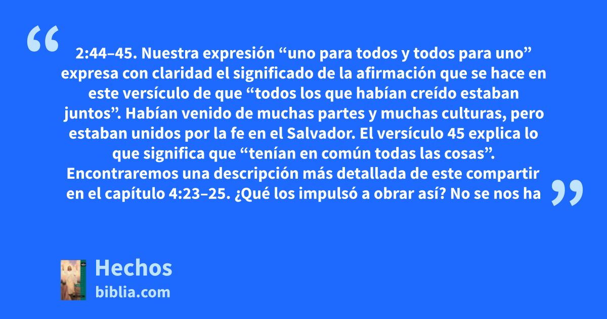 2:44–45. Nuestra expresión “uno para todos y todos para uno” expresa con claridad el significado de la afirmación que se hace en este versículo de que “todos los que habían creído estaban juntos”. Habían venido de muchas partes y muchas culturas, pero estaban unidos por la fe en el Salvador. El versículo 45 explica lo que significa que “tenían en común todas las cosas”. Encontraremos una descripción más detallada de este compartir en el capítulo 4:23–25. ¿Qué los impulsó a obrar así? No se nos ha