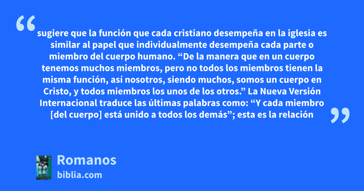 sugiere que la función que cada cristiano desempeña en la iglesia es similar al papel que individualmente desempeña cada parte o miembro del cuerpo humano. “De la manera que en un cuerpo tenemos muchos miembros, pero no todos los miembros tienen la misma función, así nosotros, siendo muchos, somos un cuerpo en Cristo, y todos miembros los unos de los otros.” La Nueva Versión Internacional traduce las últimas palabras como: “Y cada miembro [del cuerpo] está unido a todos los demás”; esta es la relación