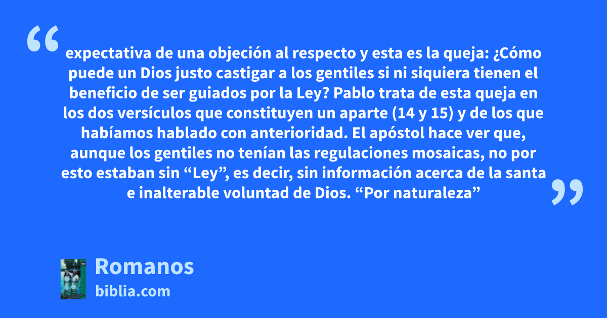 expectativa de una objeción al respecto y esta es la queja: ¿Cómo puede un Dios justo castigar a los gentiles si ni siquiera tienen el beneficio de ser guiados por la Ley? Pablo trata de esta queja en los dos versículos que constituyen un aparte (14 y 15) y de los que habíamos hablado con anterioridad. El apóstol hace ver que, aunque los gentiles no tenían las regulaciones mosaicas, no por esto estaban sin “Ley”, es decir, sin información acerca de la santa e inalterable voluntad de Dios. “Por naturaleza”