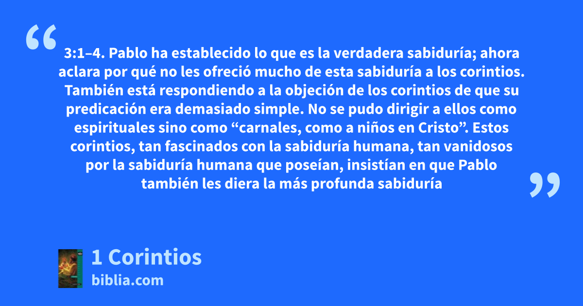 3:1–4. Pablo ha establecido lo que es la verdadera sabiduría; ahora aclara por qué no les ofreció mucho de esta sabiduría a los corintios. También está respondiendo a la objeción de los corintios de que su predicación era demasiado simple. No se pudo dirigir a ellos como espirituales sino como “carnales, como a niños en Cristo”. Estos corintios, tan fascinados con la sabiduría humana, tan vanidosos por la sabiduría humana que poseían, insistían en que Pablo también les diera la más profunda sabiduría