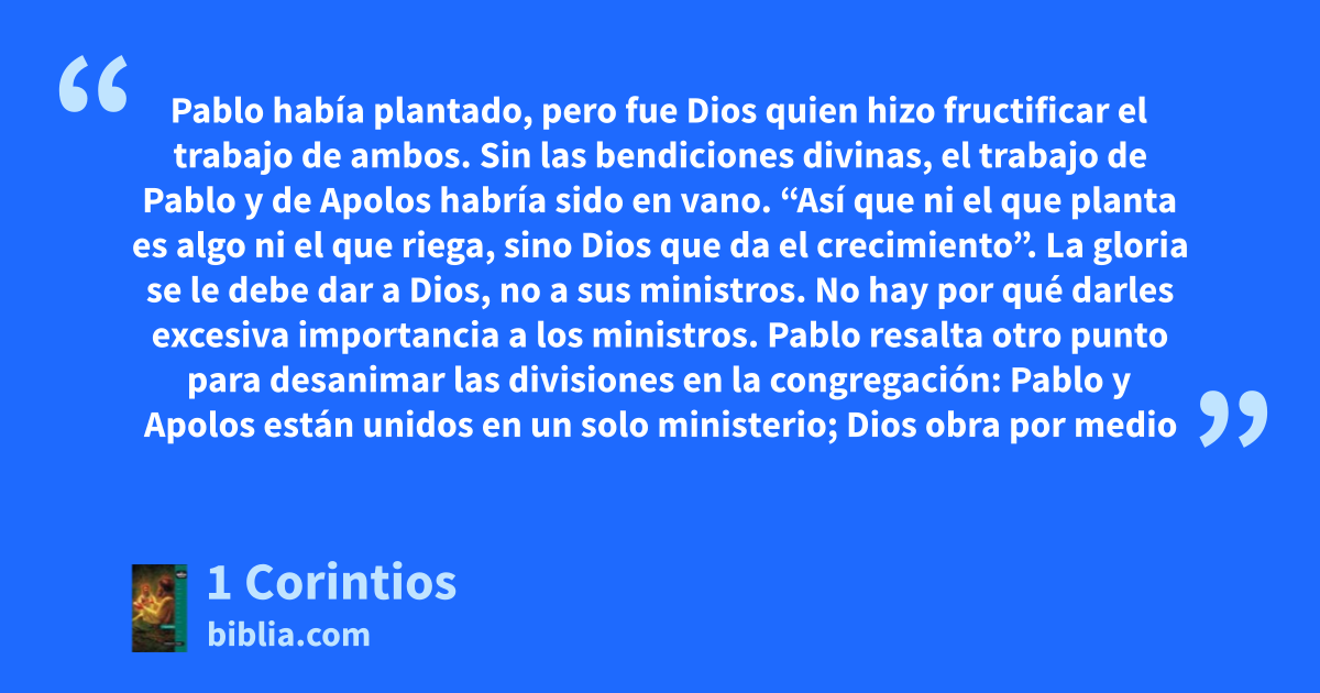Pablo había plantado, pero fue Dios quien hizo fructificar el trabajo de ambos. Sin las bendiciones divinas, el trabajo de Pablo y de Apolos habría sido en vano. “Así que ni el que planta es algo ni el que riega, sino Dios que da el crecimiento”. La gloria se le debe dar a Dios, no a sus ministros. No hay por qué darles excesiva importancia a los ministros. Pablo resalta otro punto para desanimar las divisiones en la congregación: Pablo y Apolos están unidos en un solo ministerio; Dios obra por medio