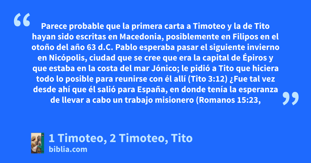 Parece probable que la primera carta a Timoteo y la de Tito hayan sido escritas en Macedonia, posiblemente en Filipos en el otoño del año 63 d.C. Pablo esperaba pasar el siguiente invierno en Nicópolis, ciudad que se cree que era la capital de Épiros y que estaba en la costa del mar Jónico; le pidió a Tito que hiciera todo lo posible para reunirse con él allí (Tito 3:12) ¿Fue tal vez desde ahí que él salió para España, en donde tenía la esperanza de llevar a cabo un trabajo misionero (Romanos 15:23,
