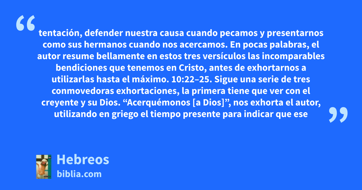 tentación, defender nuestra causa cuando pecamos y presentarnos como sus hermanos cuando nos acercamos. En pocas palabras, el autor resume bellamente en estos tres versículos las incomparables bendiciones que tenemos en Cristo, antes de exhortarnos a utilizarlas hasta el máximo. 10:22–25. Sigue una serie de tres conmovedoras exhortaciones, la primera tiene que ver con el creyente y su Dios. “Acerquémonos [a Dios]”, nos exhorta el autor, utilizando en griego el tiempo presente para indicar que ese