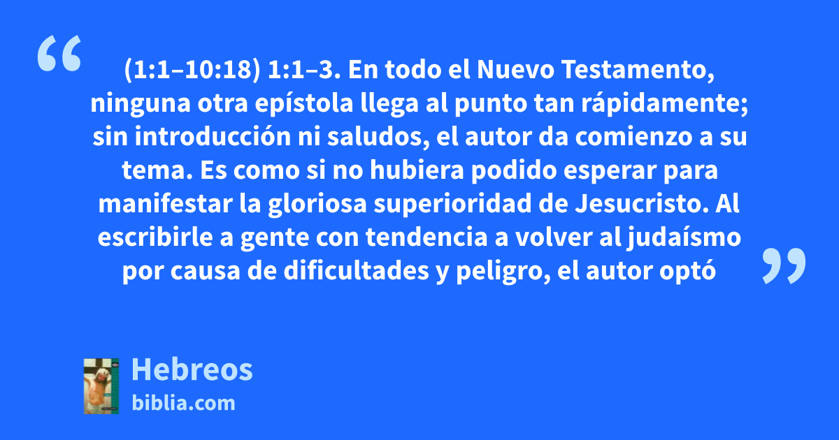 (1:1–10:18) 1:1–3. En todo el Nuevo Testamento, ninguna otra epístola llega al punto tan rápidamente; sin introducción ni saludos, el autor da comienzo a su tema. Es como si no hubiera podido esperar para manifestar la gloriosa superioridad de Jesucristo. Al escribirle a gente con tendencia a volver al judaísmo por causa de dificultades y peligro, el autor optó