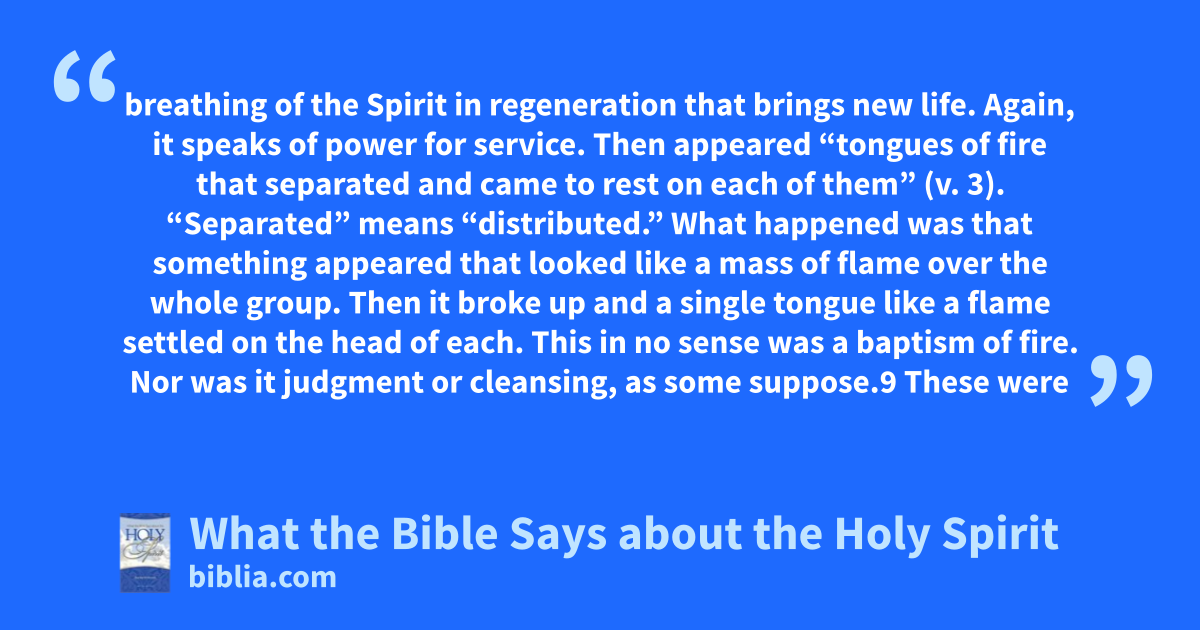 breathing of the Spirit in regeneration that brings new life. Again, it speaks of power for service. Then appeared “tongues of fire that separated and came to rest on each of them” (v. 3). “Separated” means “distributed.” What happened was that something appeared that looked like a mass of flame over the whole group. Then it broke up and a single tongue like a flame settled on the head of each. This in no sense was a baptism of fire. Nor was it judgment or cleansing, as some suppose.9 These were