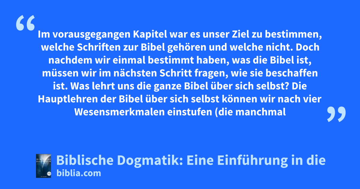 Im vorausgegangen Kapitel war es unser Ziel zu bestimmen, welche Schriften zur Bibel gehören und welche nicht. Doch nachdem wir einmal bestimmt haben, was die Bibel ist, müssen wir im nächsten Schritt fragen, wie sie beschaffen ist. Was lehrt uns die ganze Bibel über sich selbst? Die Hauptlehren der Bibel über sich selbst können wir nach vier Wesensmerkmalen einstufen (die manchmal