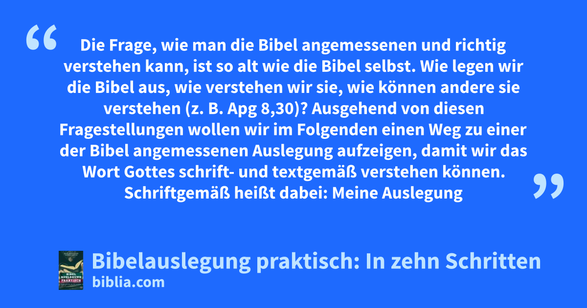 Die Frage, wie man die Bibel angemessenen und richtig verstehen kann, ist so alt wie die Bibel selbst. Wie legen wir die Bibel aus, wie verstehen wir sie, wie können andere sie verstehen (z. B. Apg 8,30)? Ausgehend von diesen Fragestellungen wollen wir im Folgenden einen Weg zu einer der Bibel angemessenen Auslegung aufzeigen, damit wir das Wort Gottes schrift- und textgemäß verstehen können. Schriftgemäß heißt dabei: Meine Auslegung